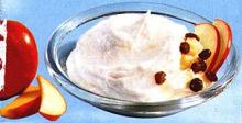 3. Das Dessert mit Apfelspalten und nach Belieben mit Rumrosinen garniert servieren.