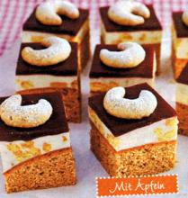 3. Äpfel schälen, entkernen und würfeln und mit Wein, übrigen Zucker, Zitronensaft und Zimtstange weich dünsten. Zimtstange entfernen, die Apfelmasse pürieren. Die restliche Gelatine in die noch warme Masse einrühren und auflösen. Abkühlen lassen und vorichtig auf der Kipferlcreme verteilen. Mind. 2 Std. kühlen. Mit 20 Kipferln dekorieren.