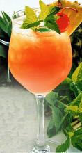 6 Eiswürfel in einen Shaker geben. 1 cl Zitronesaft, je 5 cl Orangen- und Ananassaft, 1 cl Grenadienesirup sowie je 3 cl weißen und braunen Rum zugeben. Im Shaker 10 Sekunden kräftig schütteln. 2 EL Crushed Ice in ein Longdrinkglas geben, die Mischung durch das Barsieb darauf abseihen. Mit Ananas, Cocktailkirsche und Minze dekorieren.