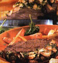 Zwiebeln in Ringe schneiden, Petersilie und Schnittlauch fein hacken. Mit Öl, Pfeffer, Majoran und Rosmarin in einer Schüssel verrühren, Fleisch herausnehmen, salzen, von allen Seiten gut anbraten und Brühe angießen. Im vorgeheizten Backofen bei 200 °C zugedeckt 75 min garen. In der Zwischenzeit Zwiebäcke grob zerbröckeln. Zwiebelringe und Kräuter aus der Marinade auf einem Sieb abtropfen lassen. Eier verquirlen, mit Zwiebackstücken, Zwiebelringen und Kräutern verrühren, mit Salz und Pfeffer würzen. Braten aus dem Ofen nehmen, mit Senf bestreichen und Zwiebackmasse darauf verteilen. Braten noch 15 bis 20 min garen, bis die Haube knusprig ist. Dazu schmecken in Butter geschwenkte Möhren- und Porreestreifen