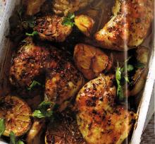 2. Zitronenstücke sowie Schalotten und Knoblauch unter und zwischen die Keulen legen. Mit Rosmarin und Oregano bestreuen und über Nacht kühl stellen.