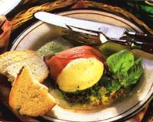 Mozzarella gut abtropfen lassen, die Kugeln quer halbieren. Die unteren Hälften jeweils mit Pesto bestreichen, mit Salz und Pfeffer würzen. Den Ofen auf 220 °C vorheizen. Paprikaschote putzen, in sehr kleine Würfel schneiden und auf den unteren Hälften verteilen. Thymian zerrebeln und darüberstreuen. Mit den oberen Mozzarellahälften abdecken. Jede Mozzarellakugel in eine Schinkenscheibe wickeln und auf einen ofenfesten Teller setzen. Die gefüllten Mozzarellakugeln im heißen Ofen bei 200 °C 10 min backen, bis sie sehr heiß sind. Die Teller mit dem Mozzarella deshalb besser auf Untersetzern servieren. Dazu passen frisches Stangenweißbrot und Radicchio Salat.
