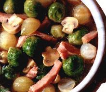 1 kg Rosenkohl putzen, waschen, abtropfen. 300 g frische Champignons putzen, waschen, halbieren. 300 g kleine Zwiebeln schälen. 40 g fette Speckwürfel im Kochtopf auslassen. Zuerst die Zwiebeln darin zart bräunen, dann Rosenkohl und Champignons dazugeben. Mit ¾ l Fleischbrühe auffüllen, aufkochen. Mit frischgeriebener Muskatnuss und Pfeffer würzen. Zugedeckt ca. 20 min garen. 250 g Kassler in Scheiben schneiden. Noch 5 min im Rosenkohleintopf mitgaren.