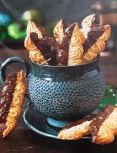 3. Den Ofen auf 180 Grad (Umluft 160 Grad) vorheizen. Den Teig mittels eines Spitzbeutels mit Sterntülle in 40 wellenförmigen Portionen auf 2 mit Backpapier belegte Backbleche spritzen. Je Blech ca. 12 min backen. Die Plätzchen herausnehmen und abkühlen lassen.