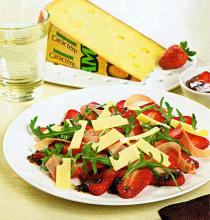 500 g Erdbeeren 100 g Rucola 2 TL Erdbeermarmelade 1 TL dunkle Olivenpaste 4 EL Olivenöl 2 EL Balsamico-Essig Salz frisch gemahlener Pfeffer 80 g Parmaschinken 1 Packung leerdammer Caractére
