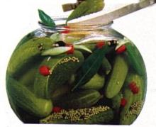 Einlegegurken mit der Nadel einstechen, mit Salz bestreuen, 24 Std. in Wasser ziehen lassen. Abgießen, Gurken und Paprikastücke in Gläser tun, Senfkörner, Piment, Lorbeer, Wacholder, Zwiebeln dazugeben. Mit kochendem Essigwasser begießen, Gläser verschließen.