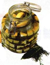 Knoblauchzehen und 3 Eßl. Kapern hacken, in Öl dünsten, mit Zitrone, Weißwein abschmecken. 400 g Schafskäse würfeln, damit mischen. Mit Weinblättern in Gläser schichten. Sud aus 3/8 l Wein, 1/8 l Olivenöl, Zitrone, Lorbeer, Thymian zubereiten und darübergießen.