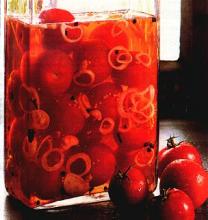 Für die Essiglösung Schalotten oder Zwiebeln abziehen und in Ringe schneiden. Mit Essig, Wasser, Salz, Zucker, Gewürznelken, Pfefferkörner und Senfkörner zum Kochen bringen, 2 min kochen lassen, von der Kochstelle nehmen. Einmach-Hilfe unterrühren und Essiglösung über die Tomaten gießen, bis die Gläser randvoll sind.